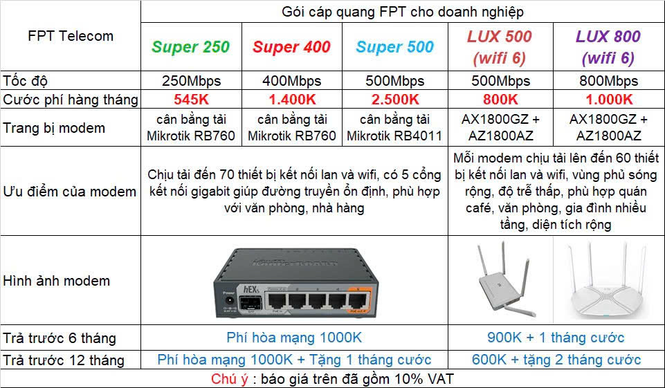 - Trả trước 12 tháng: Miễn phí chi phí lắp đặt, trang bị miễn phí Access Point trị giá 3.500.000đ hoặc tặng thêm 01 tháng cước. Riêng gói Super 500 được tặng 01 tháng cước và trang bị Access Point trị giá 5.000.000đ.