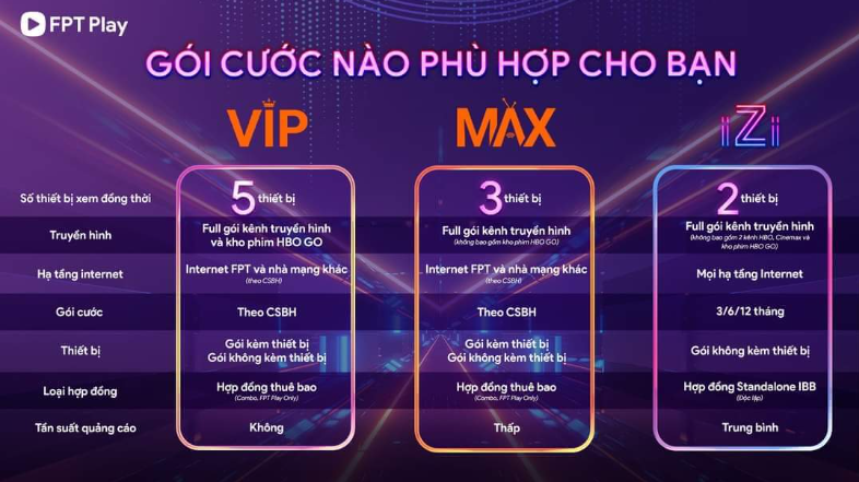 So sánh các gói cước của FPT Play – Gói VIP – Gói MAX – Gói iZi
